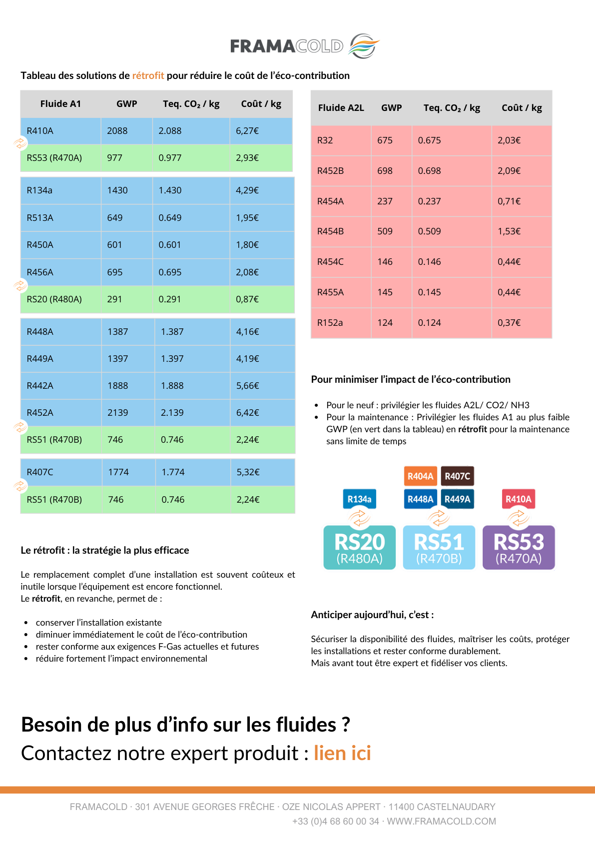 Framacold accompagne les professionnels du froid et de la climatisation dans leur transition F-Gas. Contactez leur expert produit pour un conseil personnalisé sur le rétrofit de vos installations.